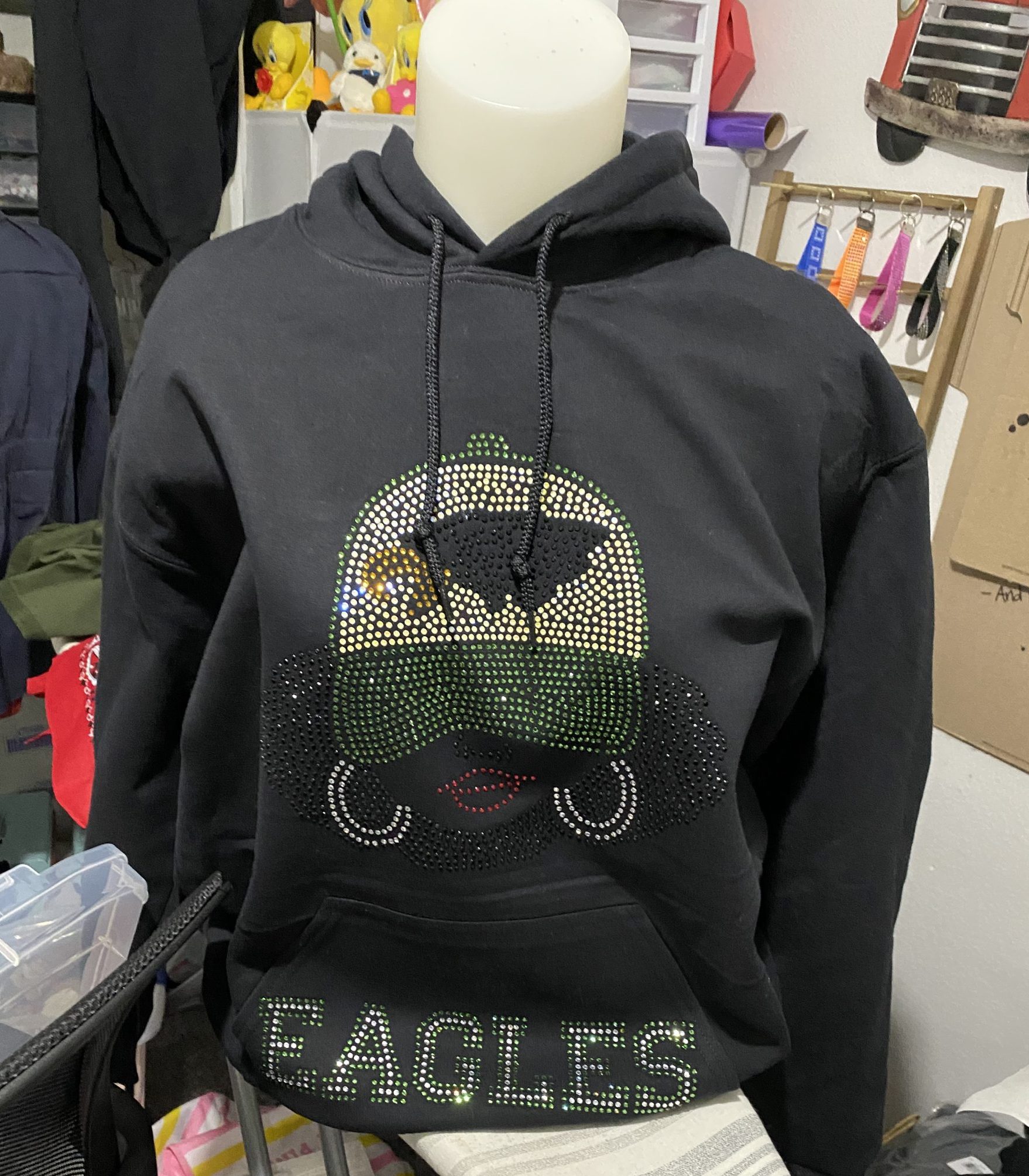 Introducing our limited edition “Eagles Glam” Black Hoodie, where style meets team spirit! This stunning hoodie features a dazzling bling outline of a woman’s face, elegantly adorned with an Eagles football hat. The word “EAGLES” at the bottom sparkles with the same eye-catching bling, making this hoodie a must-have for any true fan. Crafted from high-quality, comfortable fabric, it’s perfect for showcasing your passion for the Eagles while staying warm and stylish. Whether you’re heading to the game or just out and about, this hoodie ensures you stand out and shine with pride. Go Eagles!